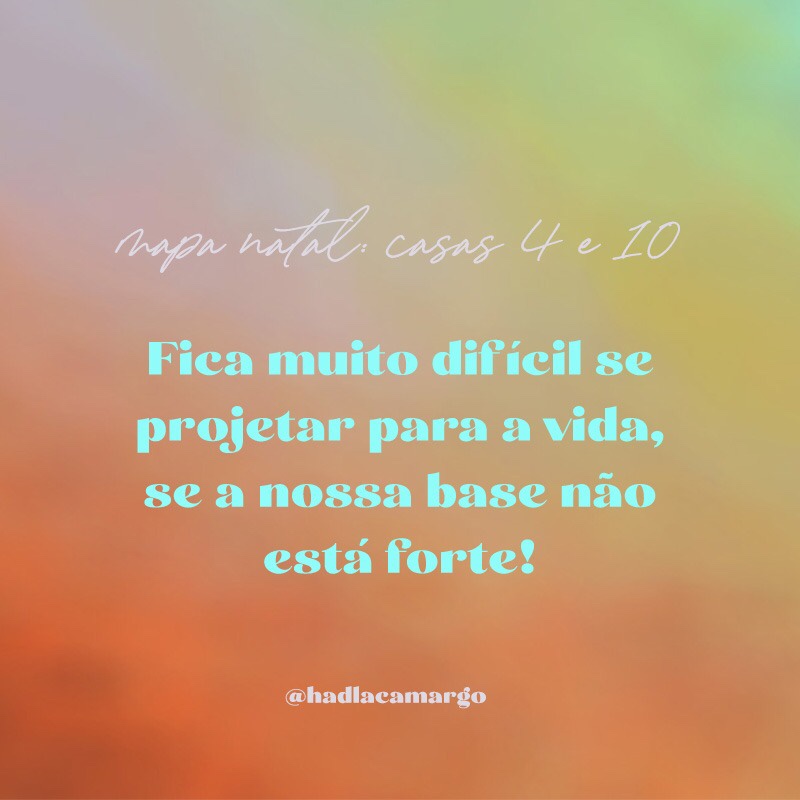 Para querer alcançar e construir lá na frente (casa 10, topo do mapa, carreira, futuro, projeção social) é preciso olhar la trás e ressignificar as feridas da base e reconhecer e tomar a força dessa base (casa 4, família, raizes, passado, nossa base emocional). Com uma casa 4 dolorida, não se chega na casa 10 com força!